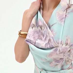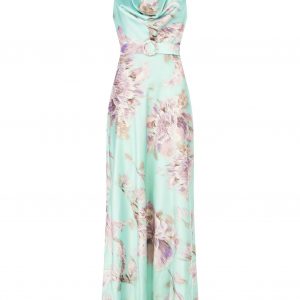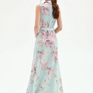 Una stampa floreale astratta, nei toni delicati del viola e del rosa, sboccia sulla base verde menta di questo abito lungo, creando un capo dal fascino etereo e ricercato.