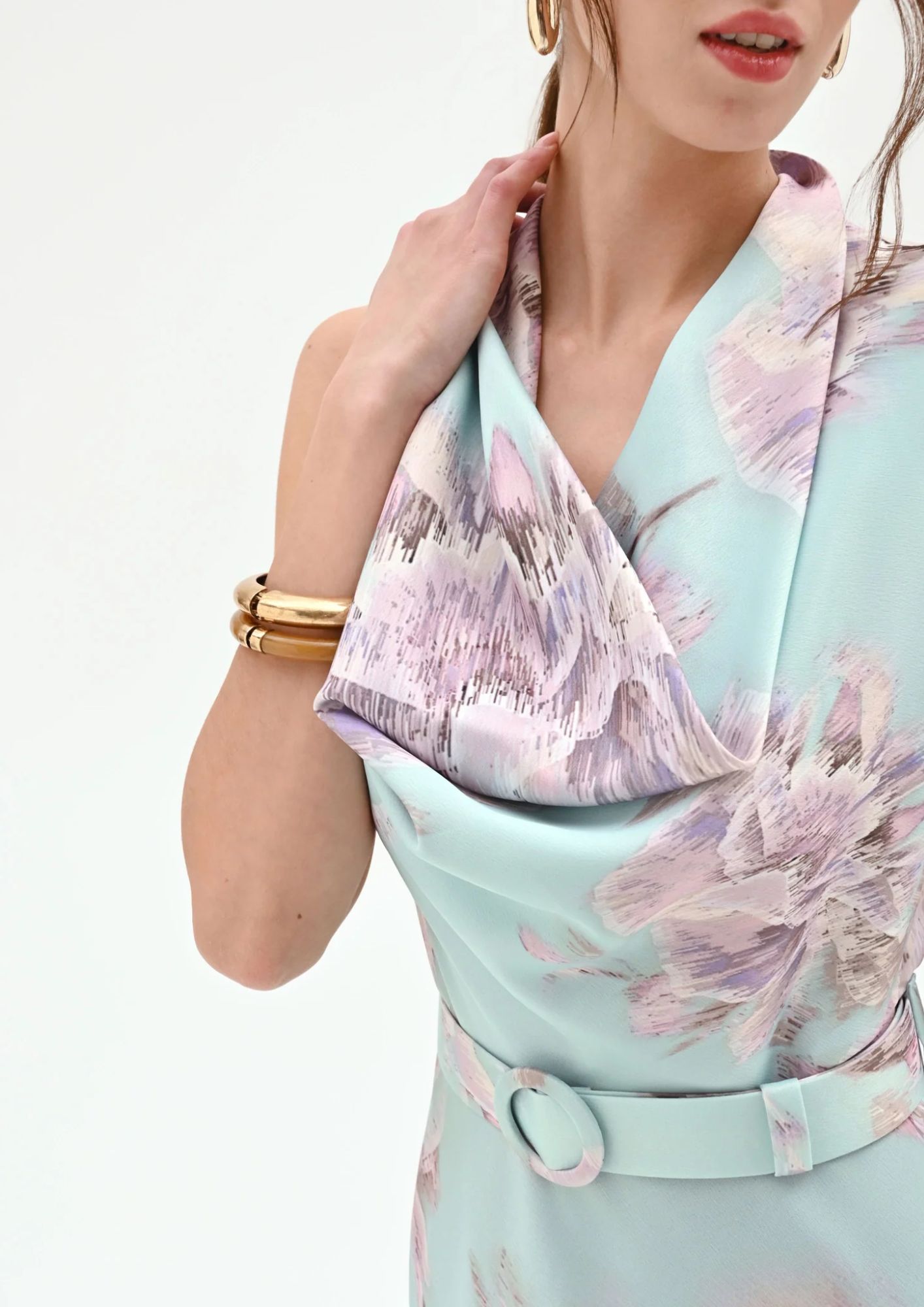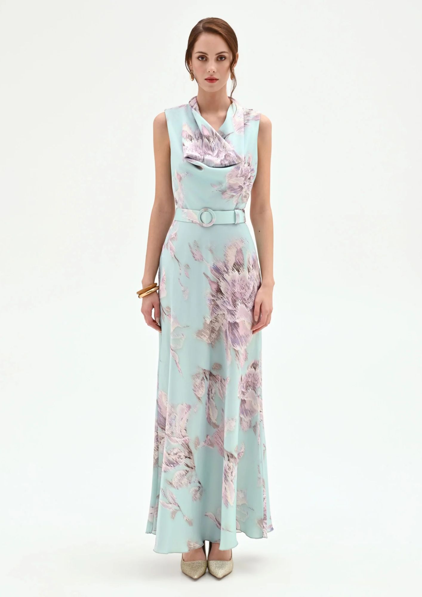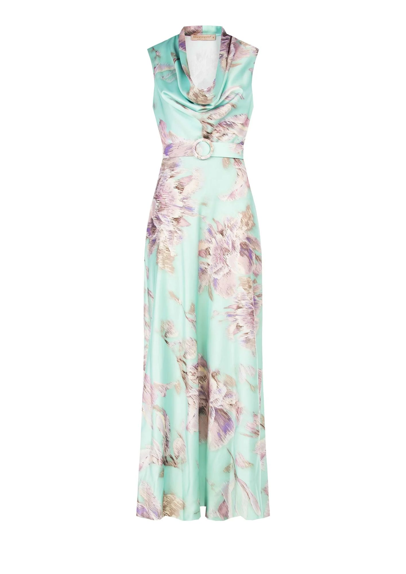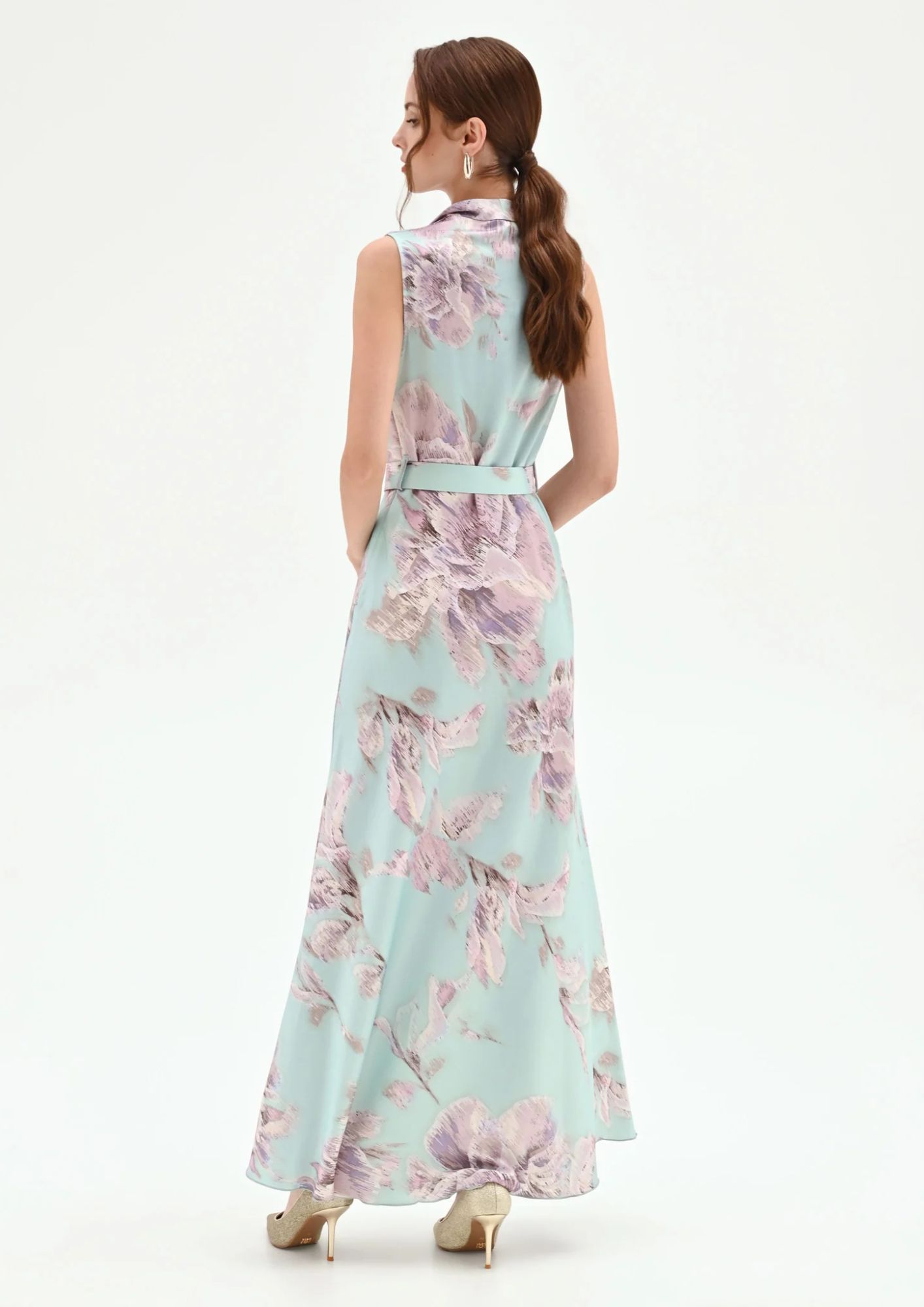 Una stampa floreale astratta, nei toni delicati del viola e del rosa, sboccia sulla base verde menta di questo abito lungo, creando un capo dal fascino etereo e ricercato.