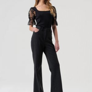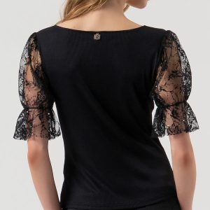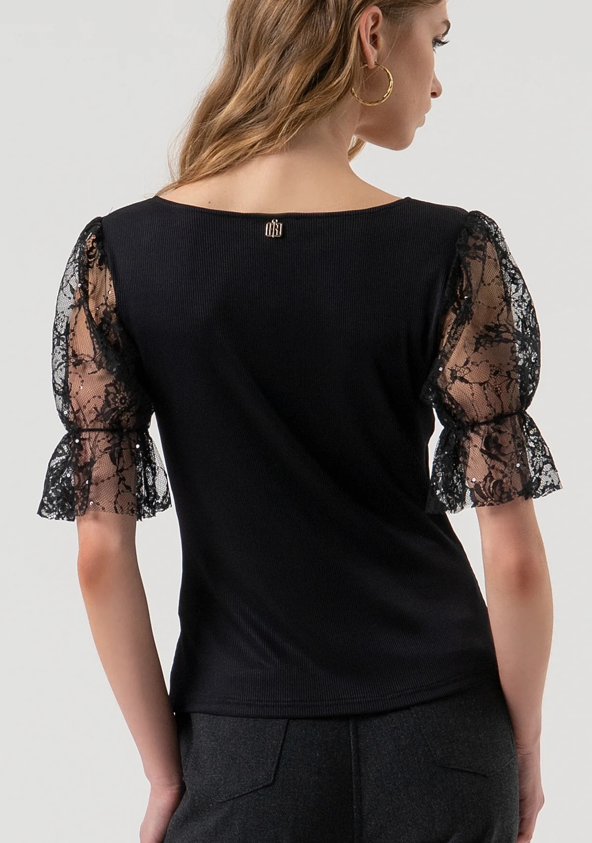 T-shirt slim con maniche corte a sbuffo in pizzo, e con scollo madonna.