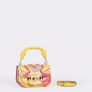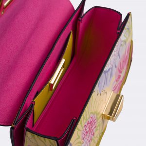 Handbag with flap made of smooth printed calfskin and leather applications, braided handle, equipped with leather shoulder strap. Iconic light gold twist lock.