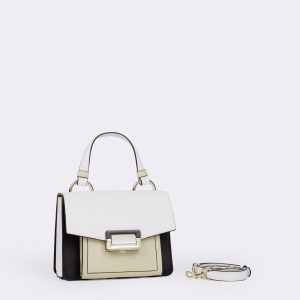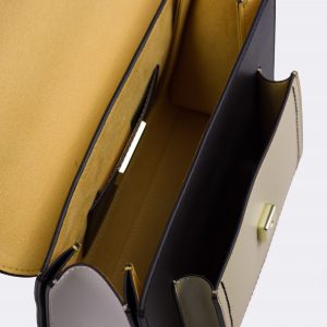 Handbag made of smooth calfskin, iconic colour combination, metallic and resin closure with a enamelled central part. Light gold finishing. Equipped with an adjustable leather shoulder strap.