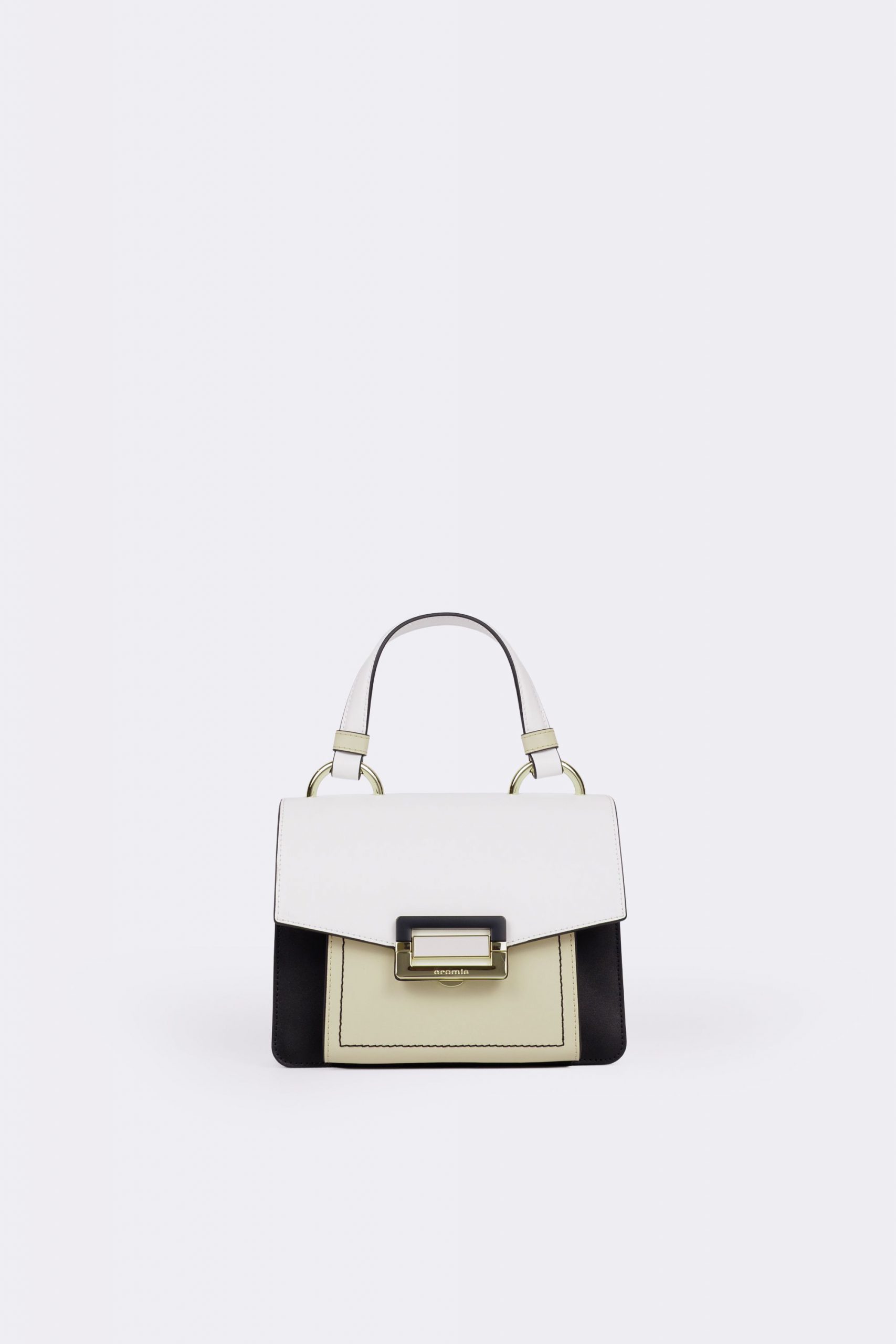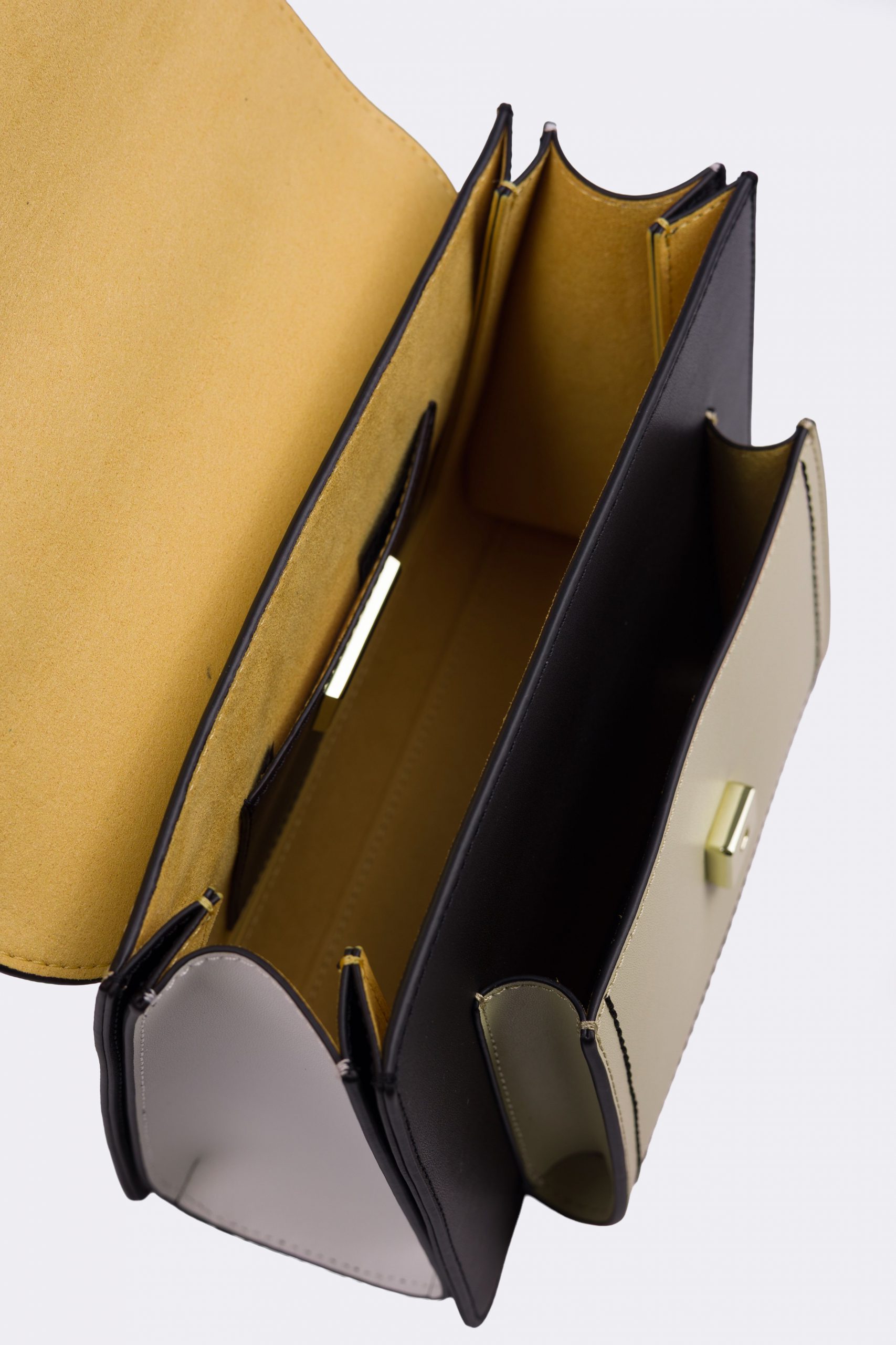 Handbag made of smooth calfskin, iconic colour combination, metallic and resin closure with a enamelled central part. Light gold finishing. Equipped with an adjustable leather shoulder strap.