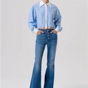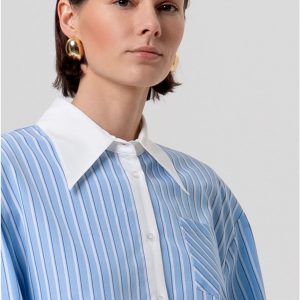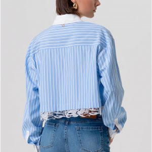 Camicia over a righe, colletto classico, apertura centrale, tasca a toppa, inserto in pizzo sul fondo, e con maniche lunghe.