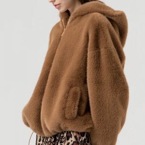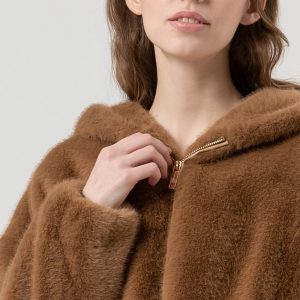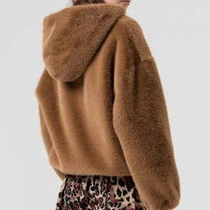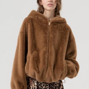 Giacca bomber regular, in finta pelliccia, con cappuccio, apertura centrale con zip, tasche laterali, coulisse sul fondo, e con maniche lunghe.