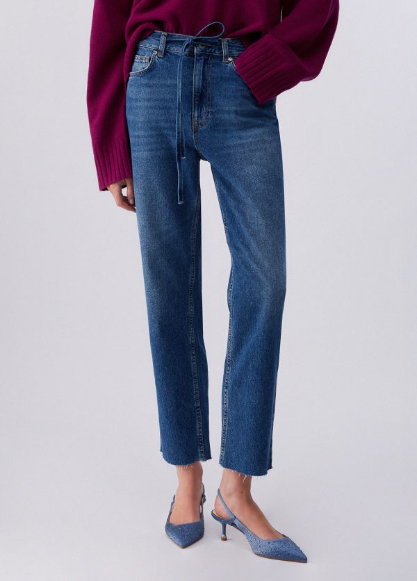 Questo jeans straight mantiene una linea pulita e versatile, proposto a vita alta per slanciare la silhouette. La cintura con maxi fiore aggiunge un accento femminile e distintivo, perfetto per i look di primavera.