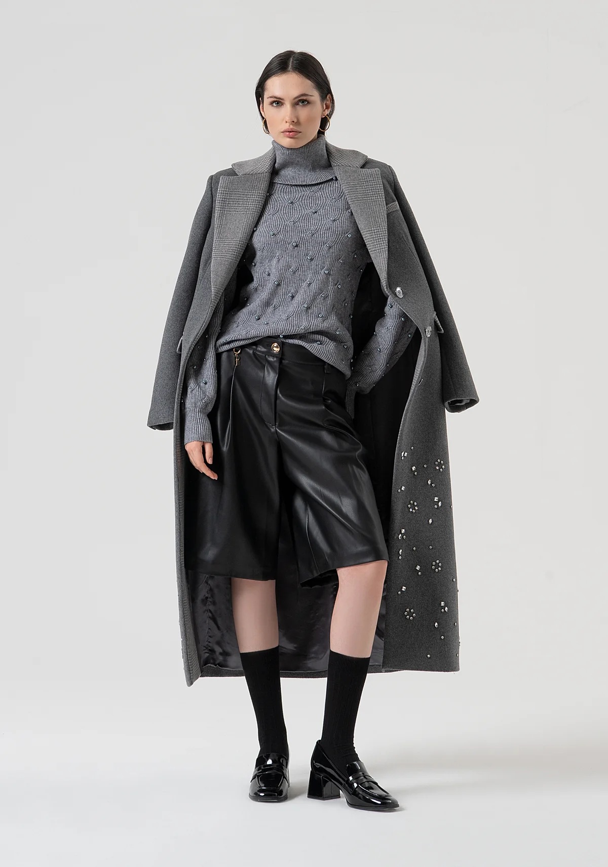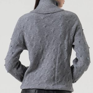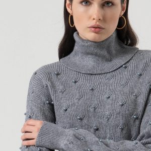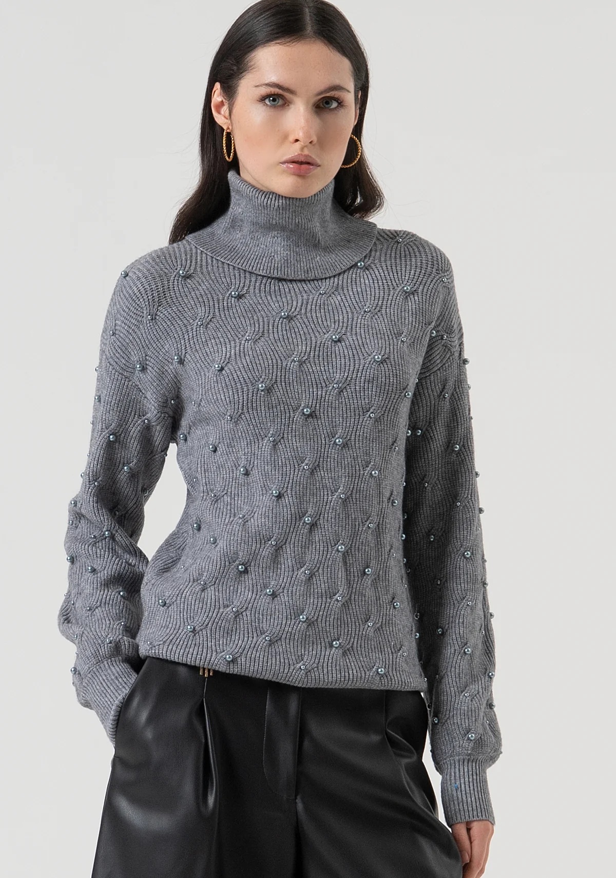 Maglia regular con punto treccia e perle, collo alto e maniche lunghe.