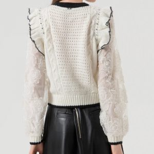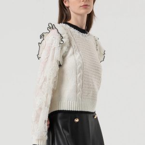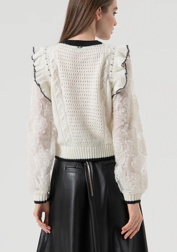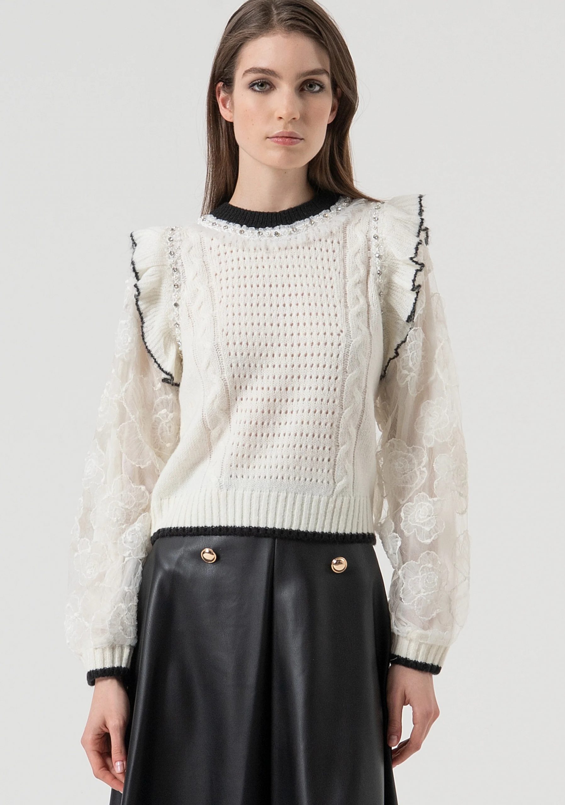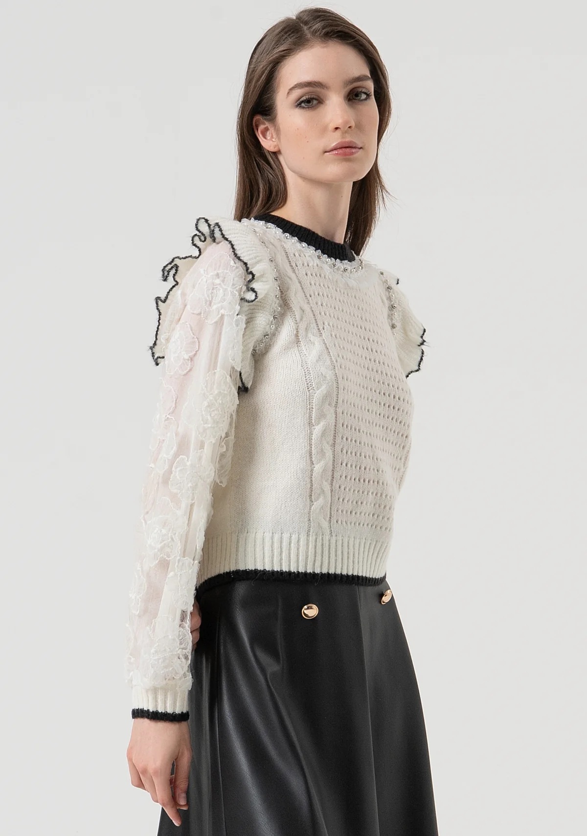 Maglia regular con punto treccia e trafori, girocollo con passamaneria applicate, rouches sulle spalle, e con maniche lunghe in pizzo.