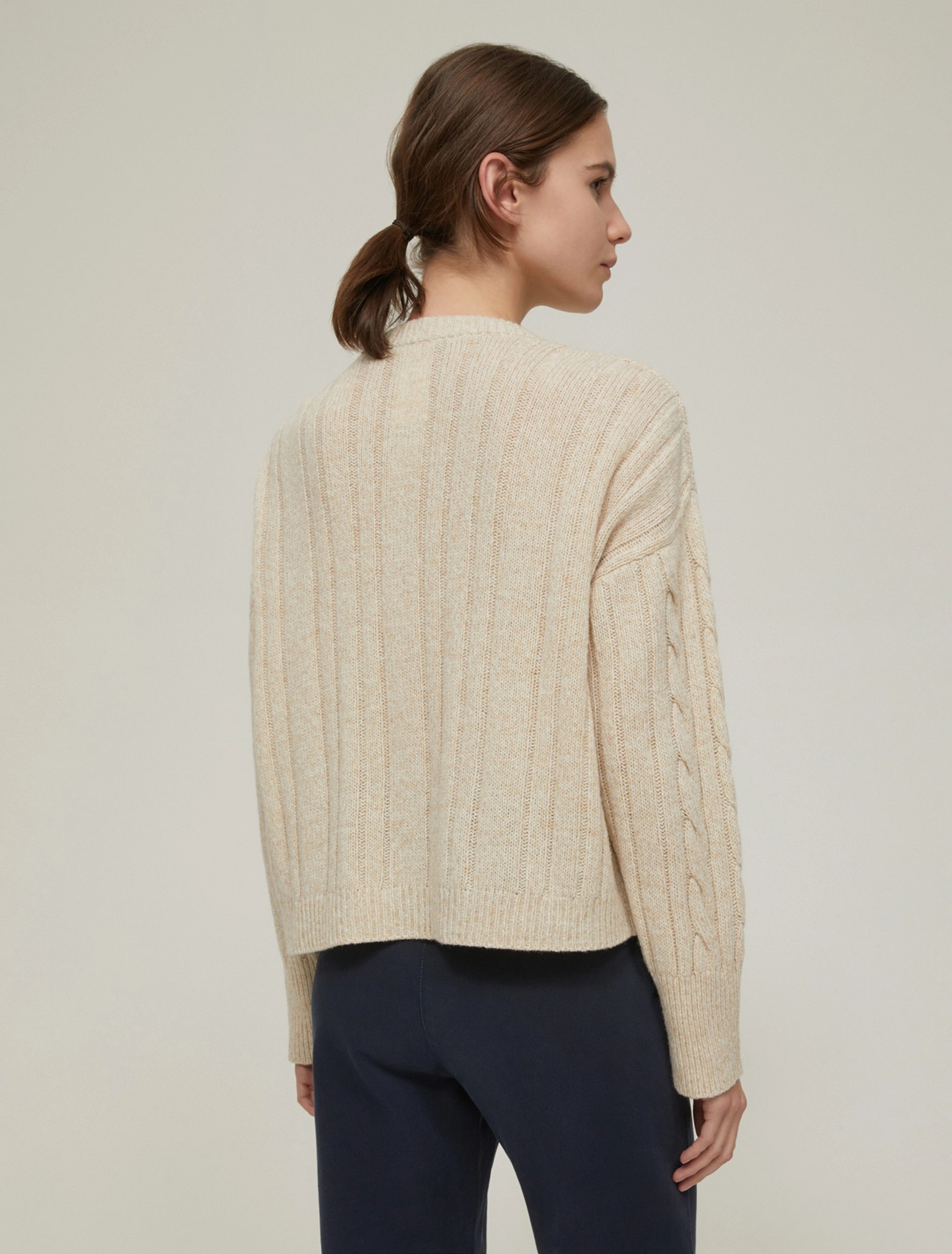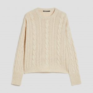 Variazione sul tema del tricot classico, la maglia in blend di lana mouliné rielabora una tradizionale lavorazione a trecce e la declina su un fit aggiornato.