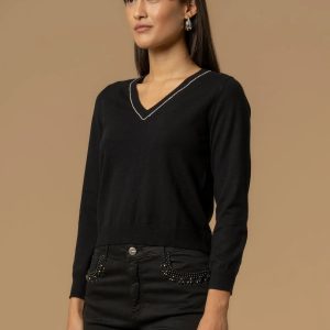 Questa maglia è caratterizzata da uno scollo a V impreziosito da una serie di strass che regalano luce e stile al capo. Questo modello presenta un taglio classico, vestibilità regolare e bordi a costine.