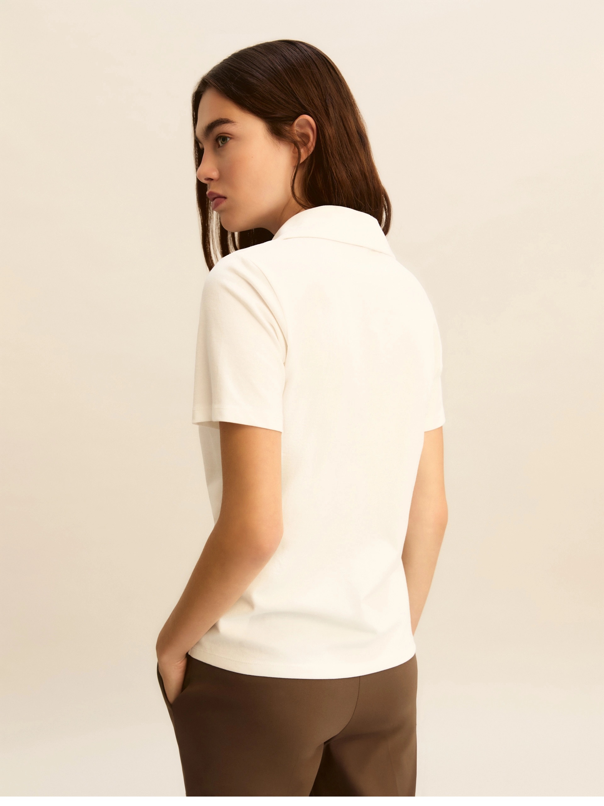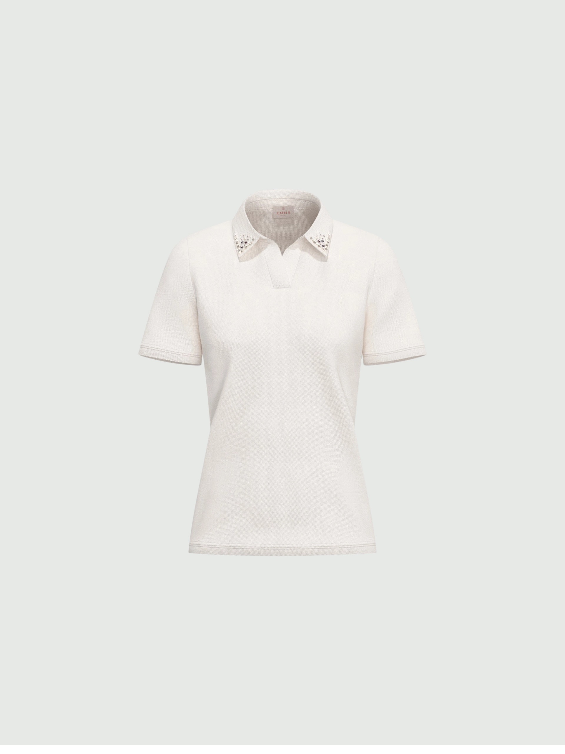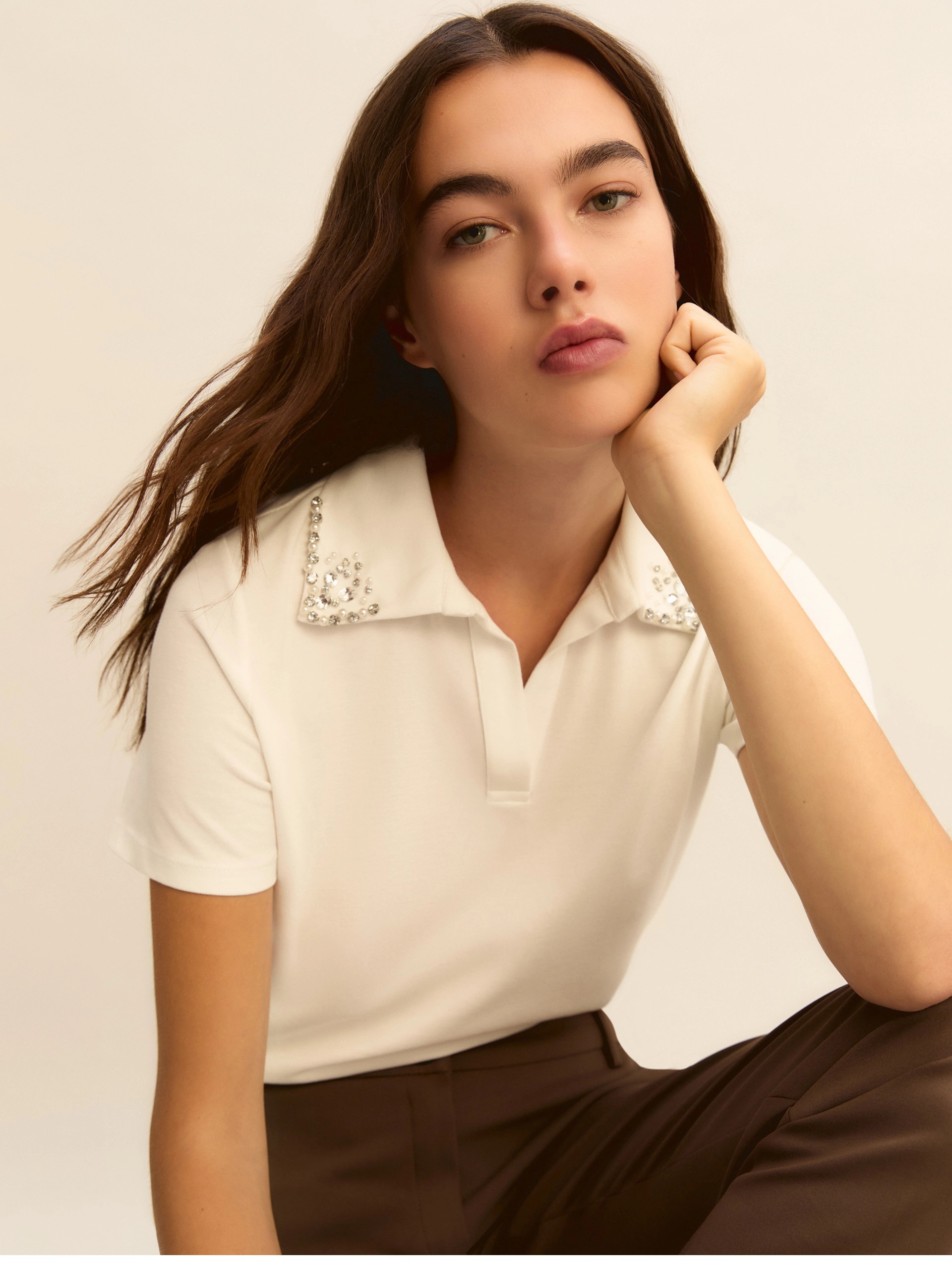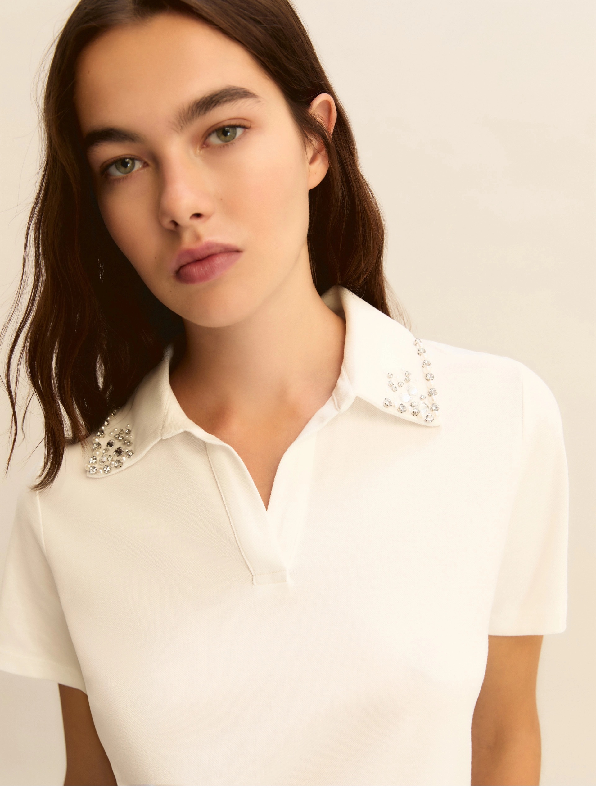 Casual nella costruzione, glamour nei dettagli: nuova polo in cotone stretch, con la classica apertura a V decorata da perle bijoux e cristalli ricamati. Un tocco di luce che rende speciale i tuoi look.